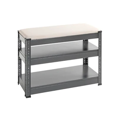 Made of powder-coated metal in anthracite 2 metal shelves for approx. 8 pairs of shoes, height-adjustable shelves MDF seat covered with grey synthetic leather Upholstered, seat cushion removable Load capacity: 90 kg