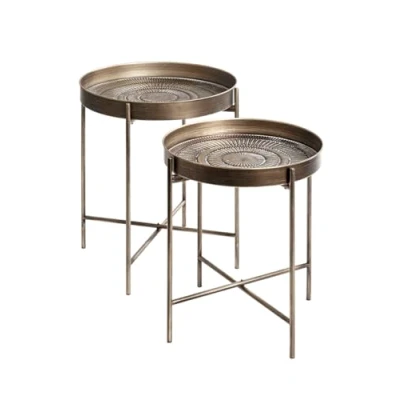Made of steel tubing painted in copper Metal shelves, wiped in copper Small table shelf diameter: 42 cm, large table: 48 cm Hinged Load capacity: 10 kg per shelf