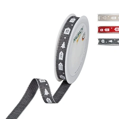 Halbach Seidenbänder Christmas Gift Ribbon with Trees and Houses Design Width 15 mm Length 20 m Ideal for Stylish Wrapping of Gifts Christmas, Colour: Grey/Black/White