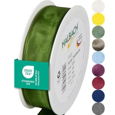 Halbach Seidenbänder Premium Gift Ribbon with Wired Edge, Width 25 mm, Length m, Oeko Tex 100 Certified Ribbon, Made in Germany, Colour: Moss Green