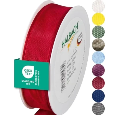Halbach Seidenbänder Premium Gift Ribbon with Wired Edge, Width 25 mm, Length m, Oeko Tex 100 Certified Ribbon, Taffeta Made in Germany, Colour: Red