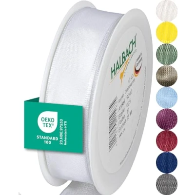 Halbach Seidenbänder Premium Gift Ribbon with Wired Edge, Width 25 mm, Length m, Oeko Tex 100 Certified Ribbon, Taffeta Made in Germany, Colour: White