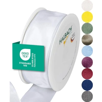 Halbach Seidenbänder Premium Gift Ribbon with Wired Edge, Width 40 mm, Length 25 m, Oeko Tex 100 Certified Ribbon, Taffeta Made in Germany, Colour: White