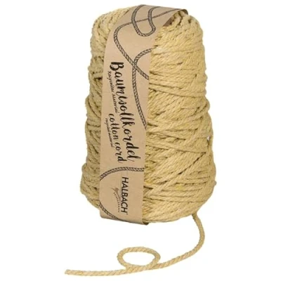 Semi-pure silk ribbons cotton cord – the cotton cord from Halbach silk ribbons is made from recycled cotton fibres (90% cotton, 10% other fibres). Top price performance – 80 metres of the 5 mm thick cotton cord are rolled up on each cone. This offers you enough material - even for your large projects. Beautiful colours: In addition to the classic natural variant, you can choose your favourite colours from 14 other trendy colours. Robust and durable: you can easily wash our cotton cord at 30 degrees. In addition, the cord is suitable for outdoor use, as it does not stain or fade. Tear-resistant quality: whether in dry or wet condition, our cord always remains stable and tear-resistant - therefore it can also be used for DIY projects where the cord is stressed.