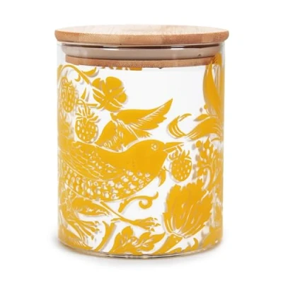 The "Strawberry Thief" design, originally created by William Morris in the late 19th century, features intricate patterns of birds and strawberries, evoking a sense of timeless charm and natural beauty Made from glass with compressed bamboo lid, making it not only durable but it also boasts a smooth, glazed finish that adds a touch of sophistication to any setting Measures approximately 5 x 4 inches From pasta and rice to flour, sugar, and snacks, this versatile canister is ideal for storing a wide range of pantry staples with ease and elegance Contained in protective packaging; Ready for easy gifting, Manufacturer: Half Moon Bay