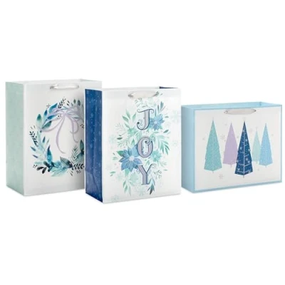 SIZE: Two large vertical gift bags each measure approximately 10.4" wide by 13" high by 5.7" deep; one large horizontal gift bag measures 13" wide by 10.4" high by 5.7" deep WINTRY DESIGNS: Set of coordinating gift bags feature 3 wintry designs: Watercolor wreath with lavender bow, modern Christmas trees with silver snowflakes, "JOY" with sage green foliage and snowflakes VERSATILE: Set of large gift bags is great for giving a variety of presents, from books and clothing to small electronics and home décor JOY TO YOUR WORLD: Make meaningful memories this holiday with gift bags, boxes and wrapping paper inspired by the magic of the season QUALITY: Crafted from high-quality paper materials, Hallmark gift wrapping supplies are made with paper from responsibly managed forests
