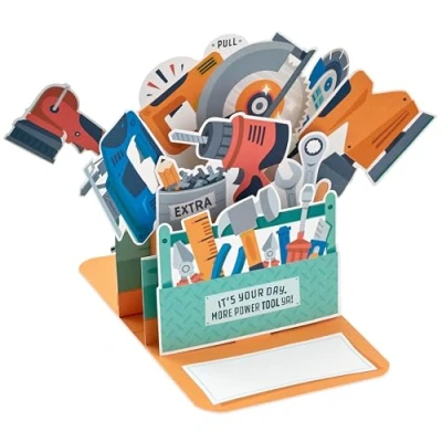 FATHERS DAY CARD: Let the father figure in your life know that no one measures up to him and that he's on another level with this fun 3D and pop-up Father's Day card. The perfect way to celebrate the best Dad, Grandad, Dad or Husband this Father's Day. 3D & POP UP FATHERS DAY CARD: Printed on high-quality board, this card pops-up into a 3D diorama of a toolbox with a pull tab to reveal all the tools, complete with DIY equipment. This card features a die-cut design and lots of toolbox details. HIGH QUALITY CONSTRUCTION & PREMIUM QUALITY CARD: This product is made using material from well-managed, FSC-certified forests and other controlled sources FATHERS DAY WISHES: Make them smile with your own personal wish to accompany our Fathers Day themed message, 'It's Your Day. More Power Tool Ya!', the perfect way to celebrate the amazing Father figure in your life, and wish him a wonderful day. SIZE: Flat card measures H20.2cm by W13.8cm, and constructed card measures H20.5cm by W27cm by D25cm. Accompanied by a Hallmark branded, blue envelope, perfect for Father's Day. Within UK 'Large Letter' Postage Size Limits