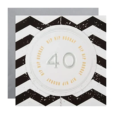 Make their 40th the event of their lifetime and stand out with this fantastically patterned card from Hallmark! This card is fully recyclable, and made of material from well-managed, FSC-certified forests and other controlled sources Printed on high-quality board with an elegant 3D attachment, embossed with gold and silver foil details and a twine attachment; the card comes complete with a co-ordinating silver Hallmark Branded Envelope Message Inside Reads: Have a Very Happy 40th Birthday Measures: 19.8 cm by 19.8 cm; Within Standard UK 'Large Letter' Size Limits