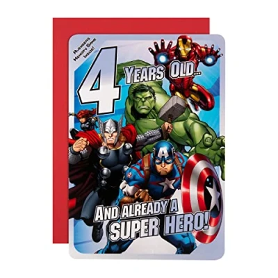 4TH BIRTHDAY CARD: Wish them a happy 4th Birthday and bring so much fun and action to their day, with this fun MARVEL Avengers card from Hallmark. With an activity inside, it's the perfect card for every little superheroes birthday! MARVEL BIRTHDAY CARD: Printed on high-quality board, this card features the MARVEL heroes, Hulk, Iron Man, Captain America, Thor, and Black Widow. This card features silver foil details and a memory game inside for your little hero to enjoy. HIGH QUALITY CONSTRUCTION & FULLY RECYCLABLE: This card is fully recyclable, and made of material from well-managed, FSC-certified forests and other controlled sources. 4TH BIRTHDAY MESSAGE: Express your own Birthday wish to accompany our message, 'Have an Awesome Birthday!'. Send a Birthday message for their fourth Birthday and make them feel like the MARVEL superheroes they love. CONVENIENT SIZE: This card measures H15.9cm by W22.8cm, and is the perfect size to wish lots of love. This card is accompanied with a co-ordinating Hallmark branded, red envelope. Within Standard UK 'Large Letter' Size Limits.
