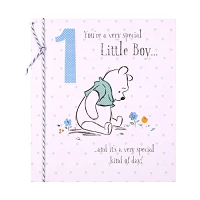 Celebrate a very special little boy on his very special 1st Birthday with this beautiful winnie-the-pooh card from Hallmark Printed on high quality board, made of material from well-managed, FSC-certified forests and other controlled sources. Features a blue and white twine attachment and embossed design elements Comes complete with a co-ordinating printed envelope Message reads: front: 1 you're a very special little boy... ...And it's a very special kind of day! Inside: it's a birthday meant for lots of love, just made to fill with fun, for a cuddly kind of someone who today is turning one! Happy 1st Birthday Measures: 18 cm by 18 cm; within Standard UK 'Letter' Size limits
