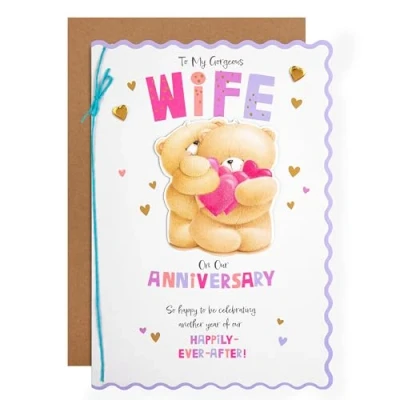 ANNIVERSARY CARD FOR WIFE: Celebrate your amazing wife on your Anniversary and make her feel extra special, with this adorable Anniversary card. The perfect way to celebrate all your love with Hallmark's timeless Forever Friends Bears. WIFE ANNIVERSARY CARD: Printed in high-quality board, this card features gold foil details, a die-cut attachment, a gold foil covered paper heart, blue twine with a bow and scalloped edges. Perfect for showing all your love on your Anniversary. HIGH QUALITY CONSTRUCTION & FULLY RECYCLABLE: This card is fully recyclable, and made of material from well-managed, FSC-certified forests and other controlled sources. LOVING MESSAGE: We've shared so many special moments since we first got married and I've loved every single one...You always know how to make the ordinary days more fun and the big occasions totally unforgettable...So, however we spend our anniversary, it's going to be amazing - because I'll be sharing it with you. Love You Lots X CONVENIENT SIZE: This Anniversary card measures H26cm by W18cm, and is the perfect size to wish all your love. This card is accompanied with a co-ordinating Hallmark branded, brown Kraft envelope. Within Standard UK 'Large Letter' Size Limits.