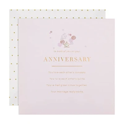 Wish a special couple a special time on their Anniversary with this lovely card from Hallmark Printed on high quality board, made of material from well-managed, FSC-certified forests and other controlled sources Features a silver star-shaped charm attachment and gold foil lettering; the card comes complete with a co-ordinating white and gold, spot patterned, Hallmark branded envelope Message Inside Reads: congratulations on your special date and your special marriage. Measures: 16 cm by 16 cm; Within Standard UK 'Letter' Size Limits