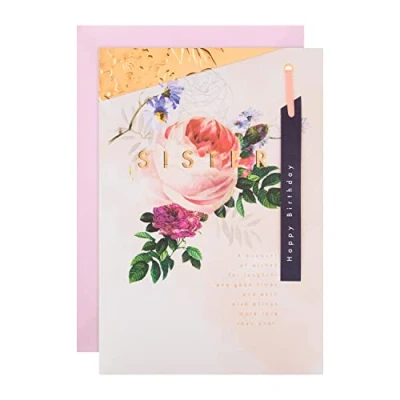 Warm your Sister's heart on her birthday and make her feel truly special, with this beautiful floral and elegantly designed birthday card; from Hallmark This card is fully recyclable, and made of material from well-managed, FSC-certified forests and other controlled sources Features embossed elements, copper foil details, a hanging attachment with a paper tassel; Comes complete with a co-ordinating Pale Pink, Hallmark branded envelope Message Inside Reads: Hope your celebrations are the best and brightest yet, With everything that makes today too precious to forget... Wishing you a lovely time and wanting you to know you're thought about and loved a lot - much more than words could show. Have a fantastic day Measures: 22.8 cm by 15.9 cm; Within UK Standard 'Letter' Size Limits
