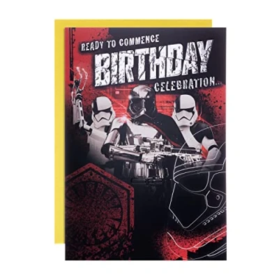 Stand to attention and give them superior Birthday celebrations with this out-of-this-world card from Hallmark This card is fully recyclable, and made of material from well-managed, FSC-certified forests and other controlled sources. Printed on high-quality board with Death-Star approved embossed silver details; the card comes complete with a coordinating Yellow, Hallmark Branded Envelope Message Inside Reads: Awaiting your orders! Measures: 22.8 cm by 15.9 cm; Within Standard UK Letter Size Limits