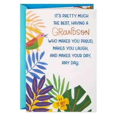 Celebrate an amazing grandson with this tropical birthday, congratulations or Father's Day greeting card Front of card features tropical leave and a colorful bird with lettering that reads, "It's pretty much the best, having a grandson who makes you proud, makes you laugh, and makes your day, any day." Inside reads: "You're that kind of grandson. Always have been. And today you're extra appreciated for the great man you've become." Card for him measures approximately 5" x 7.2" and comes with coordinating envelope Printed on high quality paper stock, Hallmark's greeting cards and envelopes are made with paper from responsibly managed forests