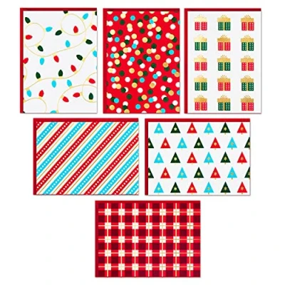 Send your friends, family, or coworkers a handwritten note with this boxed set of festive blank cards, appropriate for Christmas and all winter long. Boxed set contains 24 cards in 6 foil accented designs (4 of each design) including wrapped presents, Christmas trees, Christmas lights, stripes, red plaid, and colorful dots. Sophisticated and simple blank cards are perfect for saying thank you, thinking of you, or happy holidays. Pack includes 24 cards and coordinating envelopes. Notecards are blank inside and measure 5.2" x 3.75". Printed on high quality paper stock, Hallmark's stationery is made with paper from well-managed forests.