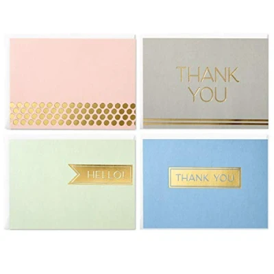 Write a note of appreciation with one of four elegant designs in this notecard set, featuring understated gold foil lettering and patterns on blue, gray, green, and pink backgrounds. Boxed set includes 40 cards (10 of each design) and 40 envelopes in coordinating colors. Blank inside, each card has plenty of space to express thanks or write a thoughtful note! Sophisticated and simple thank you cards are a charming way to send a note of thanks after birthdays, weddings, baby showers, or job interviews. Notecards are blank inside and measure 5.5" x 4". Box features Velcro closure and is reusable for card organization. Printed on high quality paper stock, Hallmark stationery is made with paper from well-managed forests.