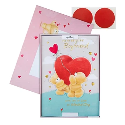 BOYFRIEND VALENTINES CARD: Wish your boyfriend a brilliant Valentine's day, with this adorable Forever Friends card and gift box, from Hallmark. This Luxury Valentines card with a gift box is the perfect way to make his day extra special with loving moments. LUXURY VALENTINES CARD: Printed on high-quality board, this card features a paper insert, embossed elements, gold foil details, 3D attachments, gold paper heart gems and a twine bow attachment, with a heartfelt message on the front. HIGH QUALITY CONSTRUCTION & FULLY RECYCLABLE: This card is fully recyclable, and made of material from well-managed, FSC-certified forests and other controlled sources. LOVING MESSAGE: Accompany our message, 'Can't wait to spend valentine's day with you... Because no one else could make me feel as happy as you always do... Thanks for being the best boyfriend in the whole world! Happy Valentine's Day x'. SIZE: This card measures 30.5cm by 21.9cm, and the gift box 32cm by 23.5cm by 1.5cm. This card is accompanied with a light pink with Forever Friends illustration gift box, and a pair of dark red seals. Suitable for hand delivery only.