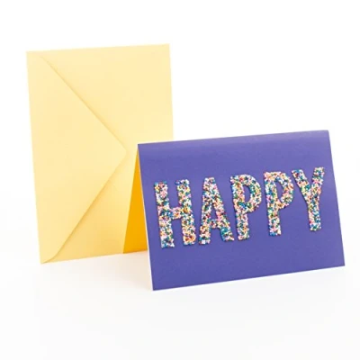 Cover message: HAPPY Inside message: Wishing you a happy birthday...With sprinkles on top! Includes one birthday card for anyone and one envelope. Card size: 5 inches wide by 7.2 inches long. Printed on high quality paper stock, this bold, unique and colorful happy birthday card includes the word "Happy" made of candy sprinkles on a blue cover. Hallmark Signature greeting cards assortment offers stylish shoppers a curated and considered line of upscale and unique cards and gifts that reflect