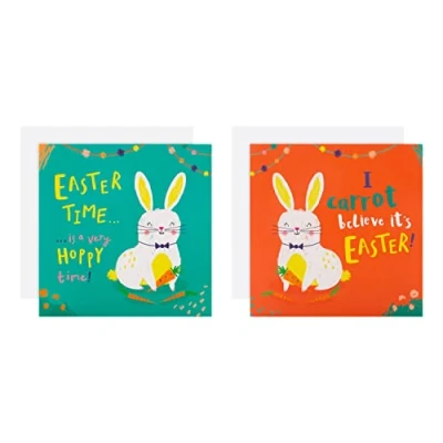 EASTER CARD PACK: For those who 'carrot' believe it's Easter, wish them all a hoppy time, with this brilliant pack of 10 humorously designed charity cards from Hallmark. The perfect way to bring joy this Easter with heartfelt greetings and festive cheer. EASTER CARDS MULTIPACK: Printed on high-quality board, this pack of 10 cards feature 2 cute Rabbit designs. 1 Design with a green background with a white rabbit, and 1 Design with a red background and a white rabbit. FULLY RECYCLABLE & PREMIUM QUALITY CARD: This card is fully recyclable, and made of material from well-managed, FSC-certified forests and other controlled sources. EASTER WISH: Express your own Easter message and festive wish, each card includes the message 'Hope yours is really brilliant!'. The perfect way to make their Easter extra special and full of sweetness and treats. SIZE: Each Easter card measures H13.1cm by W13.1cm, and is the perfect way to celebrate Springtime. The cards are accompanied with co-ordinating Hallmark branded, white envelopes. Within Standard UK 'Letter' Size Limits. CHARITY EASTER CARDS: Hallmark is proud to support Barnardo's UK and Ireland with a 50,000 Pounds contribution. The contribution will be paid in full by end of March 2023; irrespective of the number of Hallmark Charity cards sold.
