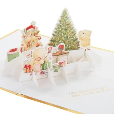 CHRISTMAS CARD: Give them a wonderful surprise, with this adorable 3D and pop-up Christmas card from our Signature Paper Wonder collection. The perfect way to bring love and warmth to their festive celebrations with Hallmark's Forever Friends bears. FOREVER FRIENDS CHRISTMAS CARD: Open this card to reveal a pop up 3D scene with Forever Friends bears wrapping presents and decorating a Christmas tree. This card features metallic gold foil details and the message, 'Happy Christmas' on the front HIGH QUALITY CONSTRUCTION & FULLY RECYCLABLE: This card is fully recyclable, and made of material from well-managed, FSC-certified forests and other controlled sources. CHRISTMAS WISH: With enough space for your own Christmas wish and special festive moment, and accompany it with our Christmas message, 'Lots of love for your best Christmas ever!', the perfect way to make them smile this festive season. SIZE: With enough space on the inside to write lots of heartfelt words and send festive blessings, this card measures H17.3cm by W11.9cm and is accompanied with a Hallmark branded, white envelope. Within UK 'Large Letter' Postage Size Limits.