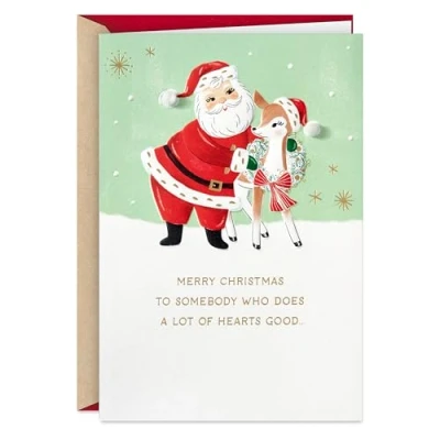 Tell someone how special they are this holiday with this charming Christmas card. Front of card features an adorable vintage Santa Claus putting a wreath on a reindeer and gold text that reads, "Merry Christmas to somebody who does a lot of hearts good…" Inside reads: "...from somebody with a heart that's grateful for you!" Christmas greeting card measures approximately 5" x 7.2" and comes with coordinating envelope Printed on high-quality paper stock, Hallmark greeting cards are made with paper from responsibly managed forests.