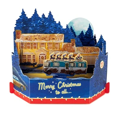 CHRISTMAS CARD: Have the hap-hap-happiest of Christmases and give something they can cherish forever, with this incredible pop-up, light and musical 3D Christmas card from Hallmark. The perfect way to deliver something truly special and magical. 3D CHRISTMAS CARD: This 3D diorama of Clark Griswold's home with cousin Eddie's Camper Van features laser-cut details, lights up and plays "Hallelujah" when the button is pressed. Create a lovely display from any angle. No assembly required! FESTIVE MESSAGE: Write a special Christmas greetings to wish them a wonderful celebration and accompany it with our festive message, ' ...and to all a good night!'. The perfect way to make sure their day is extra special and full of joy. LARGE SIZE: The flat card measures H16cm by W23cm by D0.6cm, and H15.5cm by W18cm by D11.2cm when constructed. This 3D Christmas card is accompanied by a Hallmark branded, bright red envelope. Within UK 'Large Letter' Postage Size Limits. HIGH-QUALITY CONSTRUCTION: This product is made using material from well-managed, FSC-certified forests and other controlled sources. BATTERY WARNING: This Is Not a Toy. KEEP OUT OF REACH OF CHILDREN. Do Not Dispose of Batteries In a Waste Bin. Only Discard Electrical/Electronic In a Separate Collection Scheme Which Cater for The Recovery and Recycling of The Materials Contained Within. Do Not Throw Card Into Fire. Non Changeable Button Cell Batteries Enclosed. If You Think Batteries Might Have Been Swallowed Or Placed Into Any Part of The Body, Seek Immediate Medical Attention.