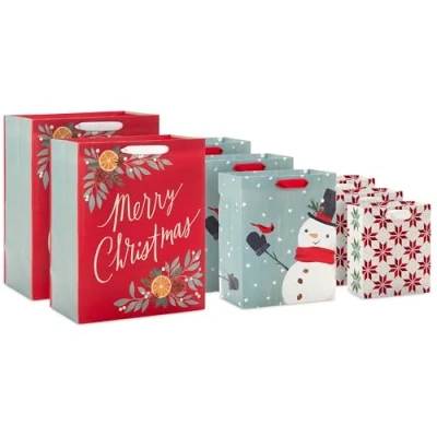 3 SIZES: Bundle of 8 gift bags includes 3 sizes: 3 small gift bags measure approximately 5.5" wide by 6.5" high by 2.9" deep, 3 medium gift bags measure 7.7" by 9.6" by 4.3" and 2 large gift bags measure 10.4" by 13" by 5.7" COZY DESIGNS: Assortment of coordinating gift bags features 3 cute and cozy Christmas designs: Quilted red snowflakes, snowman and cardinal on gray, and "Merry Christmas" lettering with citrus slices, pinecones and leaves VERSATILE: Set of 8 assorted gift bags is great for giving a variety of gifts from gift cards and jewelry to a books, candles, toys, clothing or small electronics JOY TO YOUR WORLD: Make meaningful memories this holiday with gift bags, boxes and wrapping paper inspired by the magic of the season QUALITY: Crafted from high-quality paper materials, Hallmark gift wrapping supplies are made with paper from responsibly managed forests