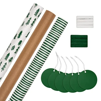 Hallmark Christmas Gifting Compendium, 3 Pack Wrapping Paper, 2M Each, 6 Gift Tags, 2 Raffia Ribbons, Rustic, Green, White Compendium