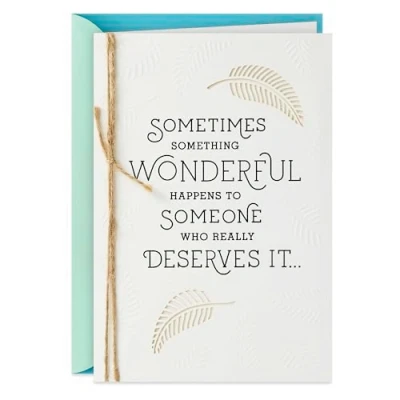 Congratulate a friend on a graduation or promotion, or wish a happy couple well with a celebratory card and a cheerful sentiment. Cover features an embossed fern leaf pattern accented with natural twine. Inside reads: "...like you! Congratulations." With a lovely design and a sincere message, this makes the perfect companion to a housewarming, engagement, or wedding gift for someone wonderful. Congrats card measures 5" x 7.2" and comes with a coordinating envelope. Printed on high quality paper stock, Hallmark's eco-friendly greeting cards are made with paper from well-managed forests.