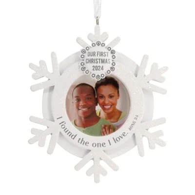 Celebrate your 1st holiday as a married couple with this year-dated photo holder Christmas ornament. White snowflake picture frame design with gold accents includes scripture quote. Message: Our first Christmas 2024. I found the one I love. Song 3:4 Approx. Size in Inches: 3 x 3.5 x 0.5. Photo Frame Area: 1.5 dia.. Great Christmas gift idea for newlyweds or any couple. Additional Details: Resin ornament features hanger attachment. Includes: One Hallmark Christmas ornament.