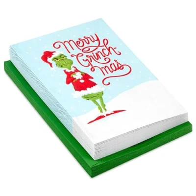 This boxed set of Grinch Christmas cards contains everything you need to send warm wishes to friends and family this holiday season. Funny holiday card features a grumpy Grinch dressed as Santa standing in the snow and playful lettering that reads, "Merry Grinch-mas" Inside reads: "Make it merry. If you want to." Holiday greeting cards measure approximately 5" x 7.2" and come with coordinating envelopes Printed on high-quality paper stock, Hallmark's greeting cards are made with paper from responsibly managed forests