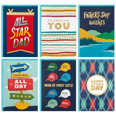 Celebrate all the amazing dads in your life with this assortment of Father's Day greeting cards Assorted card pack features 24 cards, 4 each of 6 unique designs, including colorful ball caps, banners, nature illustrations, diamonds, stripes and more; each card includes a charming sentiment with room to write a personalized message Father's Day card assortment is great to have on hand for celebrating dads, grandfathers, uncles, brothers, sons, coworkers, friends, coaches and other father figures who mean so much to you Father's Day greeting cards measure approximately 4.4" x 6.4" and come with coordinating envelopes Printed on high-quality paper stock, Hallmark's greeting cards are made with paper from responsibly managed forests