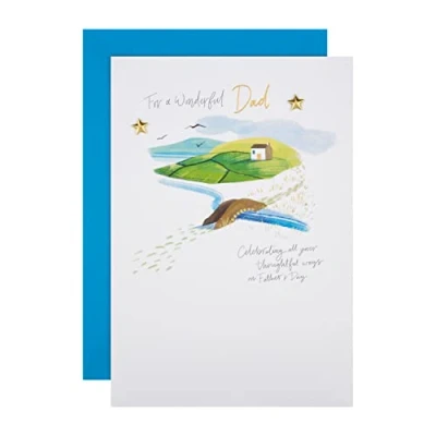Celebrate all your Dad's thoughtful ways and wonderful kindness, this Father's Day, with this beautiful scenic card, from Hallmark This card is fully recyclable, and made of material from well-managed, FSC-certified forests and other controlled sources Features gold foil details, a paper insert, gold star paper charms; card comes complete with co-ordinating, Blue, Hallmark branded envelope Message Inside Reads: Hope today reminds you just how much you mean Measures: 22.8 cm by 15.9 cm; Within Standard UK 'Letter' Size Limits