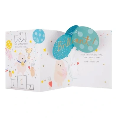 FATHERS DAY CARD: Say a massive happy Father's day to your number one dad with this fun Father's day card. The perfect way to celebrate and appreciate everything he does for you and share all your love. 3D & POP UP FATHERS DAY CARD: This Father's day card features gold foil details, embossed elements, die cut details and comes complete with a Hallmark branded, confetti patterned envelope. When the card is opened balloons pop up inside. HIGH QUALITY CONSTRUCTION & FULLY RECYCLABLE: This card is fully recyclable, and made of material from well-managed, FSC-certified forests and other controlled sources. MESSAGE: The message on the back reads 'You are Brilliant! Oh, OK then - one big thing. Thanks for everything. Happy Father's Day' and includes a space for your own message. This heartfelt note makes it a perfect way to share your love this Fathers Day. SIZE: This card measures H22.8cm by W15.9cm and fits within UK 'Letter' Postage Size Limits. This ensures it can be easily mailed without any hassle, making it convenient for you to send your warm wishes their home this Fathers Day.