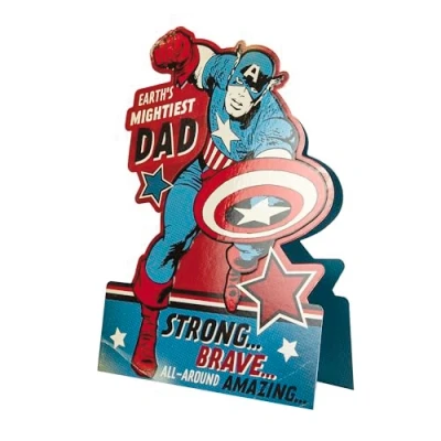 FATHERS DAY CARD: Say a happy Fathers Day to your amazing dad with this fun freestanding MARVEL card with Captain American from Hallmark. The perfect way to celebrate a day all about him and show him how super you think he is, he is the best dad after all. MARVEL FATHERS DAY CARD: This card features a die cut and freestanding design in a retro comic book style of MARVEL's Captain American, with the message 'Earth's Mightiest Dad, Strong... Brave... All-Around Amazing...', perfect for a Super Dad. FULLY RECYCLABLE & PREMIUM QUALITY CARD: This card is fully recyclable, and made of material from well-managed, FSC-certified forests and other controlled sources. SUPERHERO MESSAGE: Write a special Fathers Day note inside the card that he'll love and accompany it with our message 'You're the Best! Happy Father's Day'. The perfect way to celebrate an amazing dad on Fathers Day and send the recognition he deserves. CARD SIZE: This card measures 22.8cm by 15.9cm and is accompanied with a co-ordinating plain white envelope. The perfect size to show off just how much you love your dad. Within UK Standard 'Letter' Size Limits.