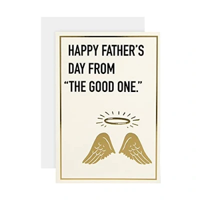 FATHERS DAY CARD: Make him laugh from you... the good one! And see if he believes you're the angel you think you are with this funny Fathers Day card from Hallmark. The perfect way to celebrate a dad, step dad, grandad and more. HAPPY FATHERS DAY CARD: Make sure he has a Fathers Day he deserves with this funny card from Hallmark. This card features a gold foil border and details, and is the perfect way to make him smile and laugh... from the 'good one'. FULLY RECYCLABLE & PREMIUM QUALITY CARD: This card is fully recyclable, and made of material from well-managed, FSC-certified forests and other controlled sources. FUNNY MESSAGE: Write a special Fathers Day note that will make him smile and accompany it with our humorous message, 'Just kidding. It's from me'. The perfect way to share your favourite moments and fondest memories. CARD SIZE: This card measures 17.3cm by 11.9cm, this card is a little message bearer and is the perfect way to show how much you care this Fathers Day. This card is accompanied by a plain white envelope. Within Standard UK 'Letter' Size Limit.