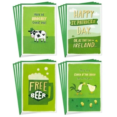 Make 'em laugh this spring with a box of funny St. Patrick's Day cards Set of cards includes four green designs, including cows, beer and chickens, with puns and funny sentiments Cards feature simple sentiments inside, with room to write a personalized message to friends, family, coworkers, neighbors and other loved ones Box of St. Patrick's Day cards contains 16 cards (4 of each design) with coordinating envelopes; cards measure approximately 5" x 7.2" Printed on high quality paper stock, Hallmark's greeting cards are made with paper from well-managed forests.