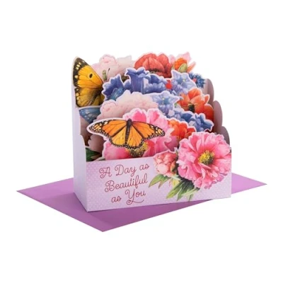GREETING CARD: Liven up their world with this beautiful Hallmark 3D pop up greeting card! A unique and inspiring gift that adds a pop of colour to any occasion. Perfect for Mother’s Day or birthdays, it’s a celebration in every unfolding! 3D CARD DESIGN: This card pops-up into a 3D diorama of flowers and butterflies on a pink background. This card features the message 'A day as beautiful as you' on the front and is part of our Marjolein Bastin Nature's Sketchbook collection. FULLY RECYCLABLE AND HIGH QUALITY: This product is fully recyclable, and made of material from well-managed, FSC-certified forests and other controlled sources. WONDERFUL MESSAGE: Write a special wish for a birthday, Mothers day and more that they'll love and accompany it with our message, 'Hoping it's every bit as wonderful as you deserve!'. The perfect way to add a personal touch no matter the occasion. SIZE: This card measures 11.6 cm by 17.3 cm when flat and 11.6 cm by 12 cm by 5.3 cm when constructed. Accompanied by a Hallmark branded, purple envelope. Within UK 'Large Letter' Postage Size Limits. The perfect size to display.