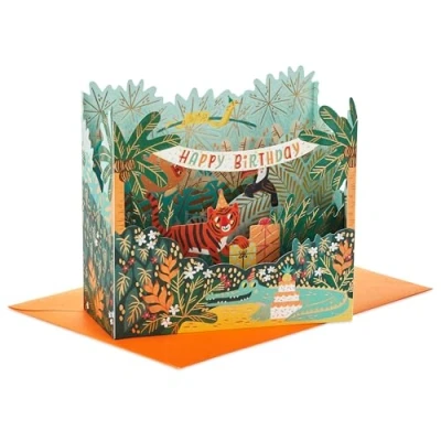 KIDS BIRTHDAY CARD: Take a walk on the wild side and make their birthday celebrations the most exciting yet, with this awesome 3D and pop-up kids birthday card from Hallmark, the most exciting way to celebrate your favourite party animal. 3D AND POP UP CARD: This card folds out to reveal a 3D and pop-up jungle scene with a smiling tiger, toucan and crocodile celebrating a birthday with gifts and a party decorations. This card features metallic gold foil details and a die cut design. FULLY RECYCLABLE & PREMIUM QUALITY CARD: This card is fully recyclable, and made of material from well-managed, FSC-certified forests and other controlled sources. EXCITING MESSAGE: Write your own special message on the back of the card to accompany our jungle-themed message, "Go wild! It's your day!". The Perfect way to make any kids birthday the most memorable yet and make sure they have the most awesome day. SIZE: Flat card measures H17.3 cm by W11.9 cm and constructed card measures H11.9 cm by W12 cm by D5.3cm. Accompanied by a Hallmark branded, orange envelope, within UK 'Large Letter' postage size limits. Perfect for brightening up their birthday celebration.