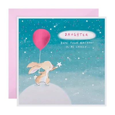 BIRTHDAY CARD: This card is a small token that carries a universe of love. It’s not just paper and ink... it’s a hug, a smile, and a wish on the stars. Choose a Hallmark card and celebrate the beauty of your daughter DAUGHTER BIRTHDAY CARD: Celebrate your daughter's birthday and make her feel as high as the sky with this adorable birthday card. With a rabbit illustration and shooting stars, this birthday card features pink foil details and a 3D add on FULLY RECYCLABLE & PREMIUM QUALITY CARD: This card is fully recyclable, and made of material from well-managed, FSC-certified forests and other controlled sources SWEET MESSAGE: Write your own special birthday wish to your amazing daughter on the inside to accompany our beautiful message, 'As you are every day of the year! Happy birthday with love'. The perfect way to wish her all the love and happiness LARGE SIZE: This birthday card measures 19.8cm by 19.8cm and is the perfect size to make their special day even better. This card is accompanied by our co-ordinating Hallmark branded light pink envelope. Within UK 'Large Letter' Size Limits