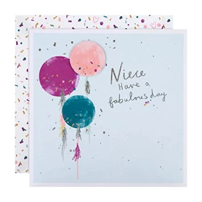 NIECE BIRTHDAY CARD: Send your beautiful niece birthday wishes filled with moments of joy and laughter with Hallmark's birthday card, the perfect way to wish her year ahead full of wonderful surprises and endless happiness. BIRTHDAY CARD FOR NIECE: Celebrate your niece's special day with this heartfelt birthday card, expressing your joy and pride in the wonderful person she is. This card features silver holographic foil details and a 3D attachment. FULLY RECYCLABLE AND HIGH-QUALITY CARD: This product is fully recyclable, and made of material from well-managed, FSC-certified forests and other controlled sources. LOVING MESSAGE: With space inside to write a fabulous birthday wish for your amazing niece and accompanied by our message, "With love on your birthday", it's the perfect way to make her birthday even more memorable and special. SIZE: This card measures 19.8cm by 19.8cm, and will make your niece's birthday feel even more special. This card is accompanied with a co-ordinating Hallmark branded, white envelope with a fun illustration. Within UK 'Large Letter' Size Limits.