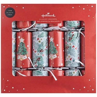 CHRISTMAS CRACKERS: Set the perfect Christmas table and have all your loved ones together with these stylish pack of 6 luxury crackers from Hallmark. The perfect way to delight all your guests this Christmas and have a bang on a celebration. FESTIVE CRACKERS: These crackers are 100% plastic free, features contemporary Christmas tree and foliage designs with metallic gold ink details and white paper twine ties. Each cracker contains a joke, a snap, a hat, a fun festive activity and a gift. RECYCLABLE: This product is made using material from well-managed, FSC-certified forests and other controlled sources. To recycle this item, please remove the ribbon ties and recycle with card and paper materials. CRACKER GIFTS: Each cracker measures 33cm by 5.5cm, ensuring a perfect fit for your festive table! Gifts include a 10cm ruler, a small padlock and keys, a yo-yo, a keyring/bottle opener, a nail file/multi-tool and a fun 'Mystery Calculator' card game. WARNING MESSAGE: Warning! Not suitable for children under 36 months. Long cord. Strangulation hazard. Some crackers contain adult gifts which are not toys and are, therefore, unsuitable for children under 14 years of age.