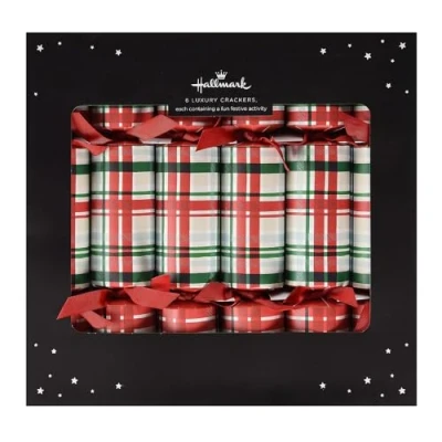 CHRISTMAS CRACKERS: Bring some traditional festive style to your table this Christmas time with these stylish pack of 6 tartan crackers from Hallmark. The perfect way to delight all your guests this Christmas and have a bang on a celebration. FESTIVE CRACKERS: These crackers feature red, white and green tartan design, with scalloped edging and red grosgrain ribbon ties. Each cracker contains a joke, a snap, a hat, a fun festive activity and a gift. RECYCLABLE: This product is made using material from well-managed, FSC-certified forests and other controlled sources. To recycle this item, please remove the ribbon ties and recycle with card and paper materials. CRACKER GIFTS: Each cracker measures 32cm by 5.6cm, ensuring a perfect fit for your festive table! Luxury gifts include a 10cm ruler, a small padlock and keys, a yo-yo, a keyring/bottle opener, a nail file/multi-tool and a fun 'Mystery Calculator' card game. WARNING MESSAGE: Warning! Not suitable for children under 36 months. Long cord. Strangulation hazard. Some crackers contain adult gifts which are not toys and are, therefore, unsuitable for children under 14 years of age.