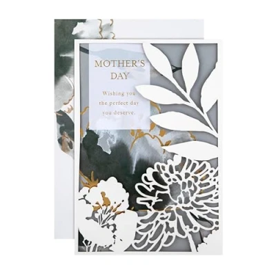 MOTHERS DAY CARD: Send them a wonderful and heartfelt message, with this beautiful Mother's Day card. The perfect way to make them smile and feel super special. MUM MOTHERS DAY CARD: Printed on high-quality board, this card features a floral design, metallic gold foil details, intricate laser cut details, paper insert, with the message 'Mother's Day, Wishing you the perfect day you deserve' on the front. HIGH-QUALITY CONSTRUCTION & FULLY RECYCLABLE: This card is fully recyclable, and made of material from well-managed, FSC-certified forests and other controlled sources. LOVING MESSAGE: Write a very special Mothers Day note and let her know how special she is, and accompany it with our message, 'With love on Mother's Day'. CARD SIZE: This card measures H22.8cm by W15.9cm, fits within UK 'Letter' postage size limits and is the perfect size to write a heartfelt note. This card comes complete with a co-ordinating Patterned envelope, Hallmark branded