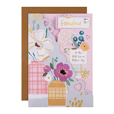 GRANDMA MOTHERS DAY CARD: Wish your lovely Grandma a love-filled Mother's day with lots of special moments and love, with this beautiful Mothers Day card from Hallmark. The perfect way to send lots of heartfelt notes and appreciation. MOTHERS DAY CARD FOR GRANDMA: This card features a gate fold design, silver paper heart gems, die-cut details, a pink and white paper twine bow attachment, embossed elements and gold foil details. The perfect way to show your Grandma how loved she is. HIGH QUALITY CONSTRUCTION & FULLY RECYCLABLE: This product is made using material from well-managed, FSC-certified forests and other controlled sources. LOVING MESSAGE: Accompany our message, 'Can't remember a time when you weren't there caring, encouraging, or sharing a treat or two.. Grandma, you're appreciated more with every mother's day.' Perfect for making their day extra special. SIZE: This Mothers day card measures H22.8cm by W15.9cm, and is the perfect size to wish lots of love. This card is accompanied with a co-ordinating brown Kraft envelope. Within Standard UK 'Large Letter' Size Limits.