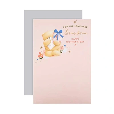 GRANDMA MOTHERS DAY CARD: Let your beloved Grandma know how much she means to you, on Mother's Day and always, with this super-cute Forever Friends Mothers Day card from Hallmark. The perfect way to share so much love and special moments. MOTHERS DAY CARD FOR GRANDMA: Printed on high-quality board, this card features an adorable Forever Friends bear holding gifts, gold foil details and lettering, and the message 'For The Loveliest Grandma, Happy Mother's Day X' on the front. HIGH QUALITY CONSTRUCTION & FULLY RECYCLABLE: This card is fully recyclable, and made of material from well-managed, FSC-certified forests and other controlled sources. LOVING MESSAGE: Express your own Mothers Day wish to accompany our loving message, 'With all the love and hugs in the world Have a Wonderful Day x'. The perfect way to make her day extra special. Make this Mothers Day the best yet! SIZE: This Mothers Day card measures 20.2cm by 13.8cm, and is the perfect size to wish lots of love. This card is accompanied with a co-ordinating Hallmark branded, pale grey envelope. Within Standard UK 'Letter' Size Limits.