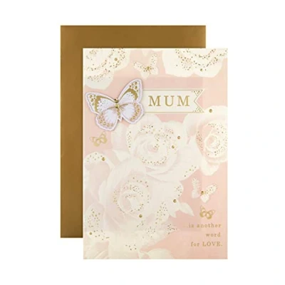 MOTHERS DAY CARD: Remind your mum that she's beautiful, wonderful and loved very much, with this gorgeous, embossed Mother's Day card from Hallmark. The perfect way to make her day extra special and full of love all the love she deserves. MOTHERS DAY CARD FOR MUM: This textured card features embossed elements, a 3D effect butterfly attachment, metallic inks, gold foil details, gold sequin attachment and a 2-page paper insert. This card comes with a Hallmark branded, metallic gold envelope. HIGH QUALITY CONSTRUCTION: This product is made using material from well-managed, FSC-certified forests and other controlled sources. MESSAGE: The front of the card reads 'Mum is another word for LOVE', inside message says 'Enjoy your very special day and always remember... ...you're beautiful, you're wonderful and you're loved so very much. Happy Mother's Day'. SIZE: Measuring H26cm by W18cm, this card fits within UK 'Large Letter' postage size limits. This ensures it can be easily mailed without any hassle, making it convenient for you to send your warm wishes to the new family.
