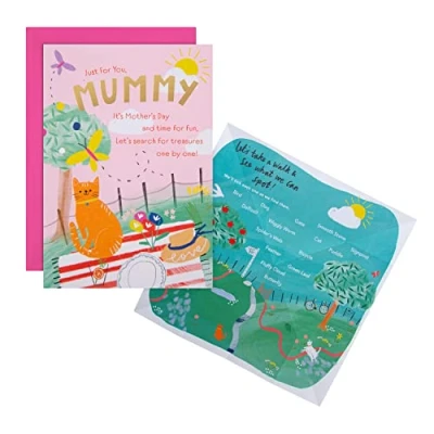 MUMMY MOTHERS DAY CARD: Take the time and spend Mothers Day making new and extra special memories with you mummy, with this adorable Mothers Day card and scavenger hunt from Hallmark. The perfect way to head out on a treasure hunt together. MOTHERS DAY CARD FOR MUMMY: This card features a cute picnic design, gold foil details and an activity treasure map inside so you and your Mummy can head out on a scavenger hunt together! Tick off what you spot, from a cat to a cloud. HIGH QUALITY CONSTRUCTION & FULLY RECYCLABLE: This card is fully recyclable, and made of material from well-managed, FSC-certified forests and other controlled sources. LOVING MESSAGE: Express your own Mother's Day wish to accompany our loving message, 'Spending time together is the best fun ever! Happy Mother's Day'. The perfect way to make their day extra special. Make this Mother's Day the best yet! SIZE: This Mothers day card measures 22.8cm by 15.9cm, and is the perfect size to wish lots of love. This card is accompanied with a co-ordinating Hallmark branded, pink envelope. Within Standard UK 'Letter' Size Limits