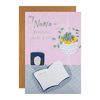 NANA MOTHERS DAY CARD: Remind your Nana how much she means to you, and how beautiful she is inside and out, with this lovely Mothers day card from Hallmark. The perfect way to make her day extra special and filled with so much love. MOTHERS DAY CARD FOR NANA: Printed on high-quality board, this card features a candle, book and plant scene design, embossed elements, silver foil details and the message 'My Nana- Beautiful Inside & Out' on the front of the card. HIGH QUALITY CONSTRUCTION & FULLY RECYCLABLE: This card is fully recyclable, and made of material from well-managed, FSC-certified forests and other controlled sources. LOVING MESSAGE: Express your own Mothers Day wish to accompany our loving message, 'Love you lots. Happy Mother's day'. The perfect way to make her day extra special. Make this Mothers Day the best yet! SIZE: This Mothers Day card measures 20.2cm by 13.8cm, and is the perfect size to wish lots of love. This card is accompanied with a co-ordinating Hallmark branded, brown Kraft envelope. Within Standard UK 'Letter' Size Limits.